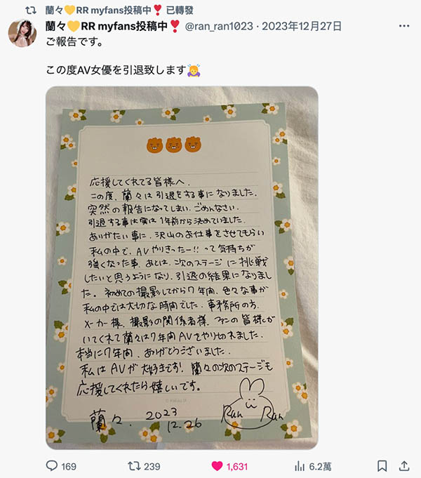 这是非常传统的引退声明,兰々提到这七年来全靠事务所、片商、活动厂商以及粉丝的支持她才能走到现在,真的非常感谢大家一路以来的陪伴;然后她真的很喜欢这一行,虽然离开有些不舍,但如果大家能够继续给她打气那她会很开心的〜
