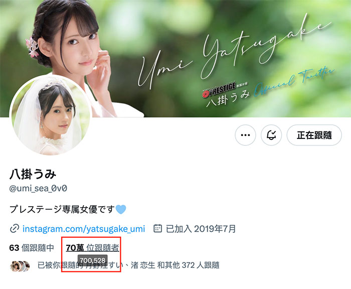 看到凉森れむ(凉森玲梦)的X(twitter)突破百万大关,相信很多朋友也注意到了,与她一样在蚊香社打拼,人气也非常旺然后也来到台湾参加TRE台北国际成人展的「八挂うみ(八挂海)」不久前X(twitter)也突破70万追踪,厉害非常非常厉害〜